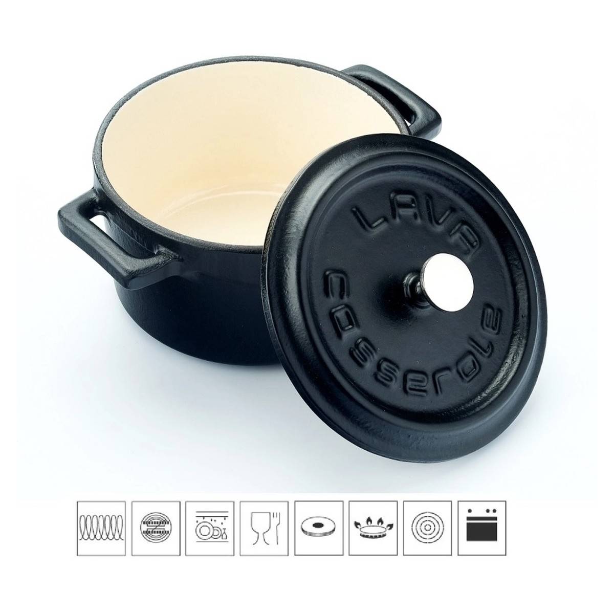 Elegantní černý hrnec s vnitřním provedením z bílého smaltu v mini velikosti, typ kokotka (z francouzského cocotte, kastrůlek). Průměr hrnce 10 cm, objem 0,35 l, skvělý pro 1 porci pokrmu, je ideální také pro stylové servírování přímo na prostřeném stole. Hrnec se tak stane ozdobou Vaší kuchyně. Litina samotná nabízí velmi vysokou tepelnou vodivost, což v kombinaci se značnou silou materiálu zaručuje vysokou efektivitu při vaření. Vhodný pro všechny druhy sporáků, včetně indukce. Mytí v myčce se nedoporučuje z důvodu utlumení jasu barev.