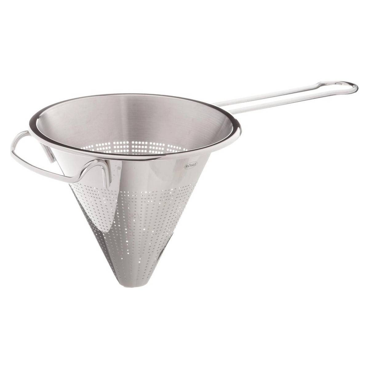 Cedník špičatý vyrobený z nerezové oceli 18/10, vhodný na zavěšení.